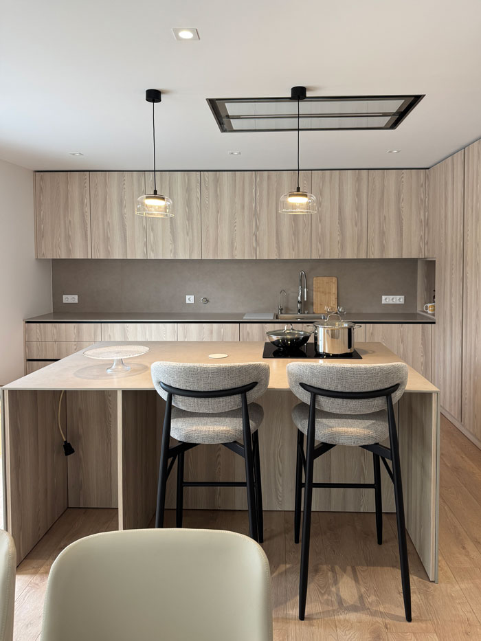 Um projeto marcado pela simplicidade bem trabalhada, onde os materiais e as cores assumem um papel central na criação de ambientes confortáveis e coerentes. A madeira clara define a base do espaço, trazendo calor e continuidade entre as diferentes zonas.