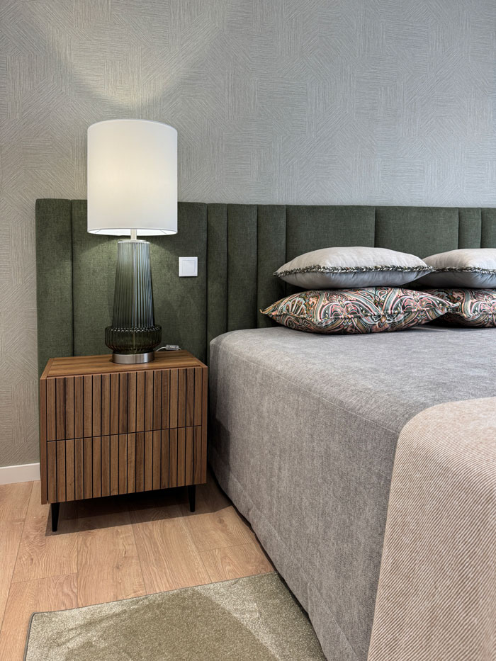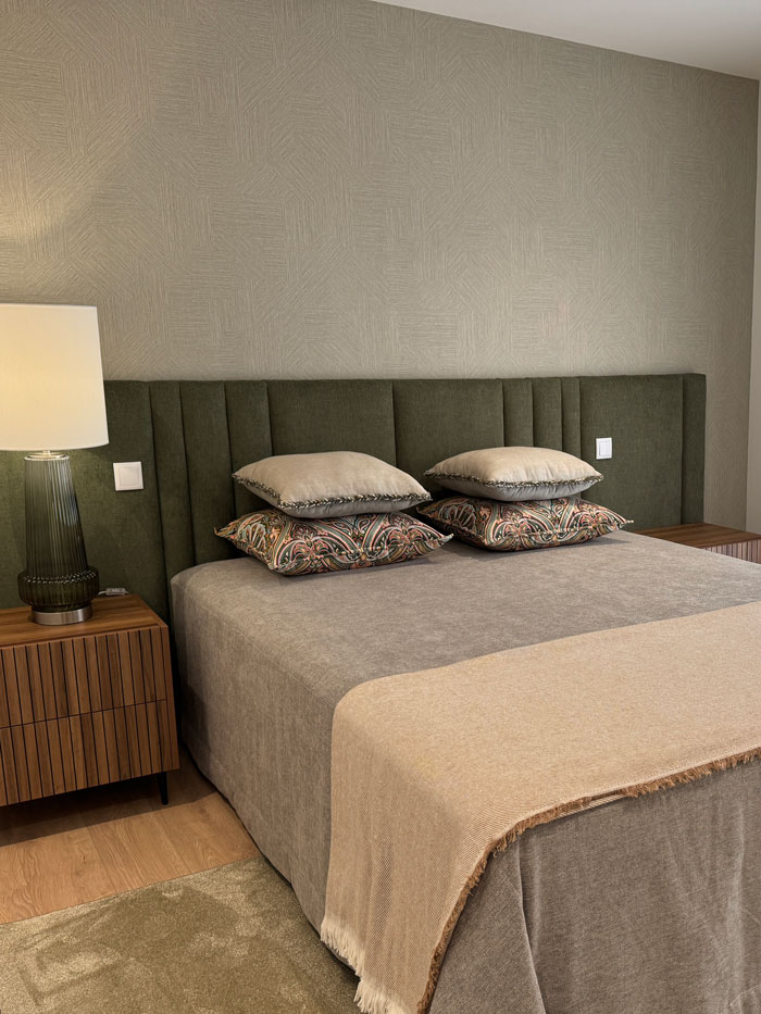 A cozinha integra-se de forma natural com a sala, criando um ambiente aberto e funcional, pensado para o dia a dia. Nos espaços de descanso, os tons neutros são complementados por apontamentos verdes e texturas suaves, garantindo conforto sem excessos.