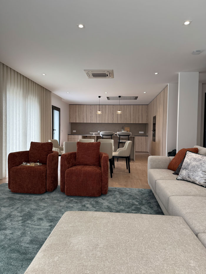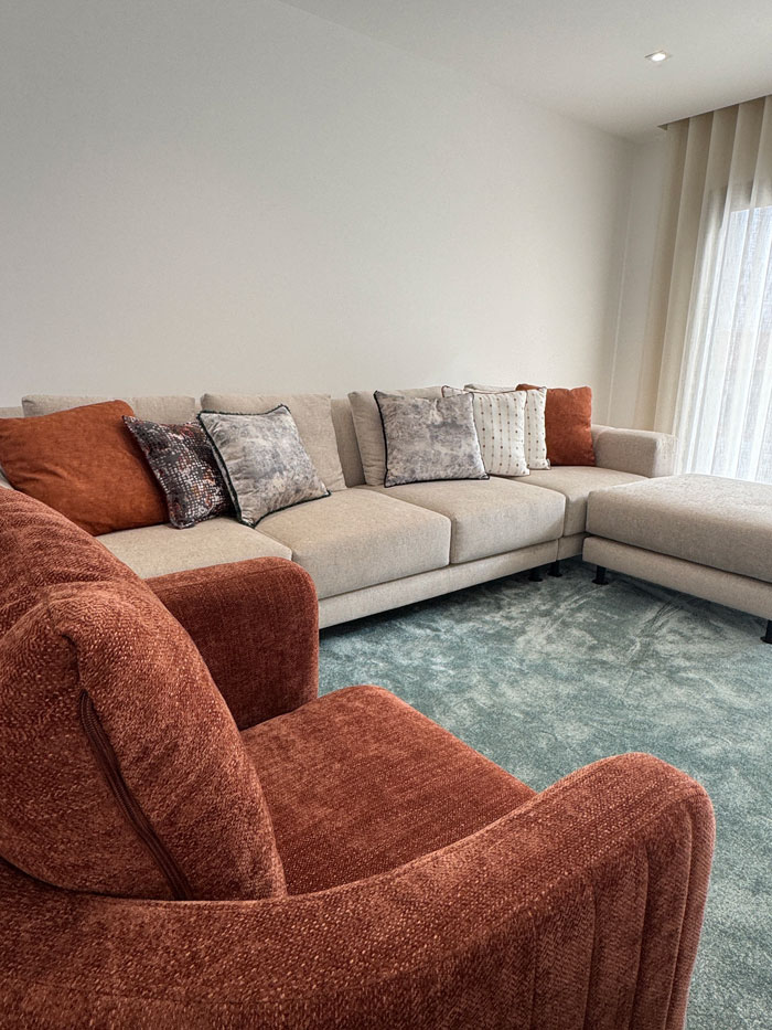 Na zona de estar, os contrastes entre os tons mais quentes e os neutros criam equilíbrio e profundidade, tornando o espaço mais acolhedor. O resultado é uma casa prática, harmoniosa e pensada para ser vivida com conforto, onde cada detalhe contribui para um conjunto consistente e intemporal.