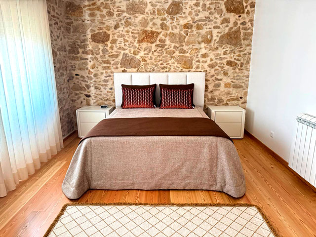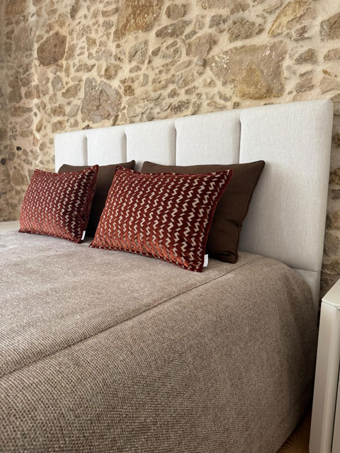 A seleção de cores partiu de uma base de tons terra, castanhos e avermelhados, escolhidos para dialogar com a parede em pedra natural e com os têxteis neutros existentes na roupa de cama. Esta combinação permite uma integração natural, sem sobrecarregar o espaço.