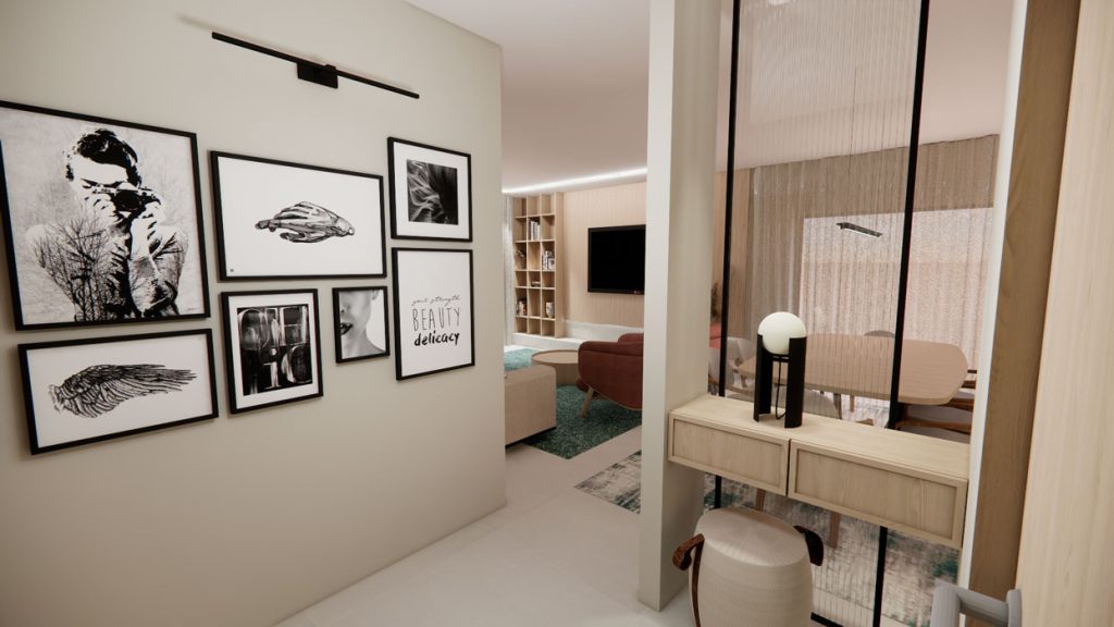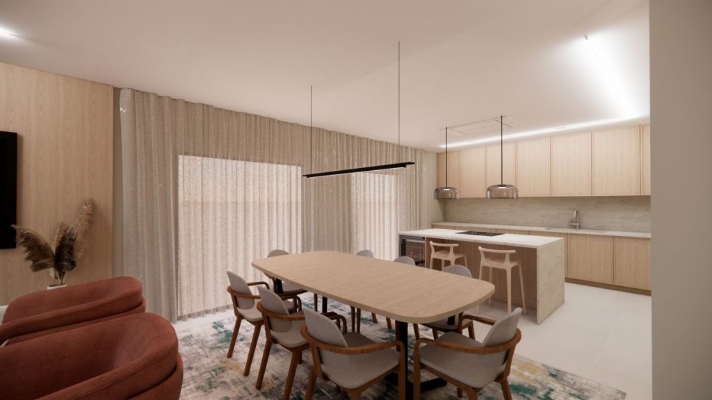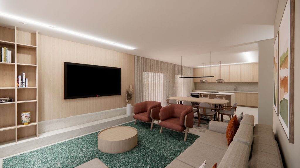 Um espaço aberto pensado para o dia a dia, onde sala e cozinha convivem de forma natural e equilibrada. A base neutra é reforçada pela madeira clara, criando um ambiente leve, contínuo e visualmente organizado.