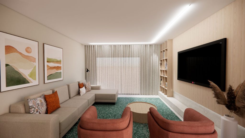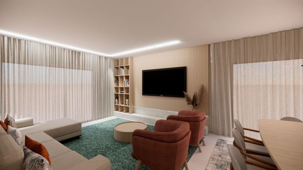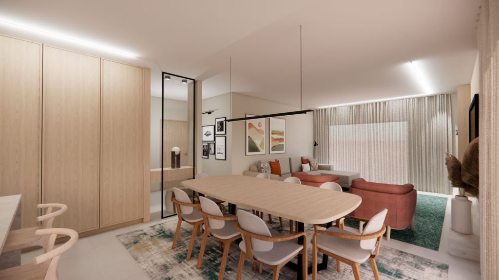 A zona de estar foi desenhada para conforto, com uma disposição que convida a ficar, enquanto os apontamentos de cor dão identidade sem pesar o conjunto. A ligação direta à zona de refeições e cozinha torna o espaço mais funcional e adaptado à rotina.