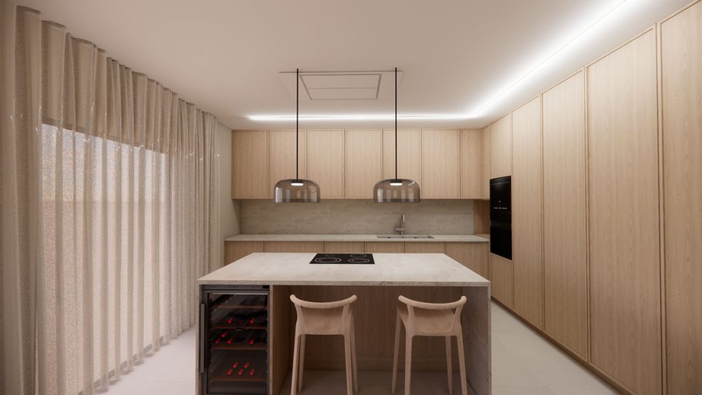Na cozinha, a solução privilegia linhas limpas e arrumação integrada, garantindo praticidade sem comprometer a estética. O resultado é um espaço coerente, onde cada detalhe contribui para uma utilização simples, confortável e bem pensada.