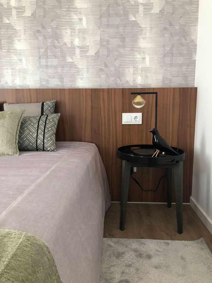 Nos quartos, os detalhes fazem a diferença. A cabeceira em madeira traz conforto e estrutura, enquanto os têxteis introduzem textura e suavidade. As cores surgem de forma controlada, criando contraste sem comprometer a serenidade do espaço.