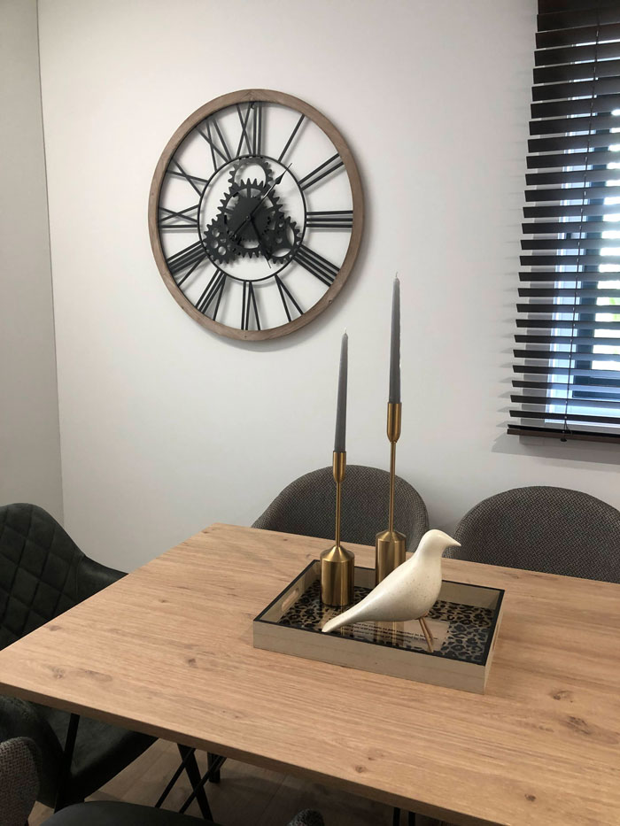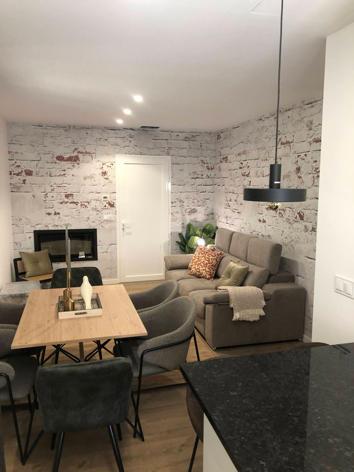 Na casa de banho, a combinação entre tons claros, madeira e elementos pretos reforça uma estética moderna e funcional, com linhas limpas e materiais duráveis. Já na zona social, o contraste entre o revestimento de parede e o mobiliário cria dinamismo, tornando o espaço mais envolvente e acolhedor.