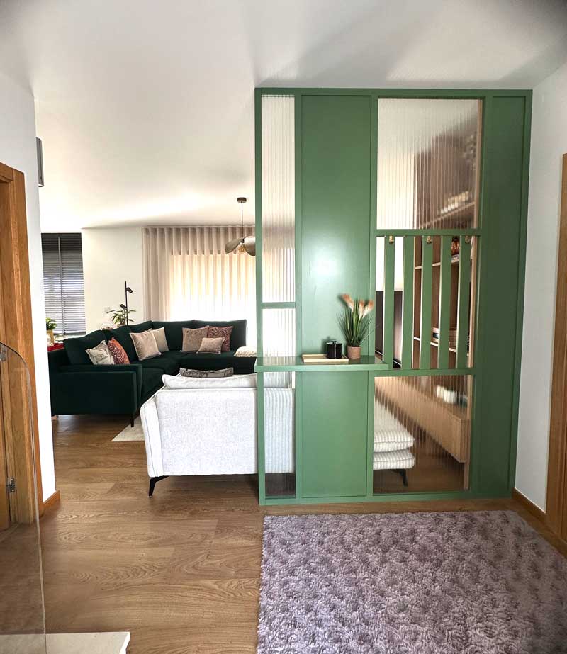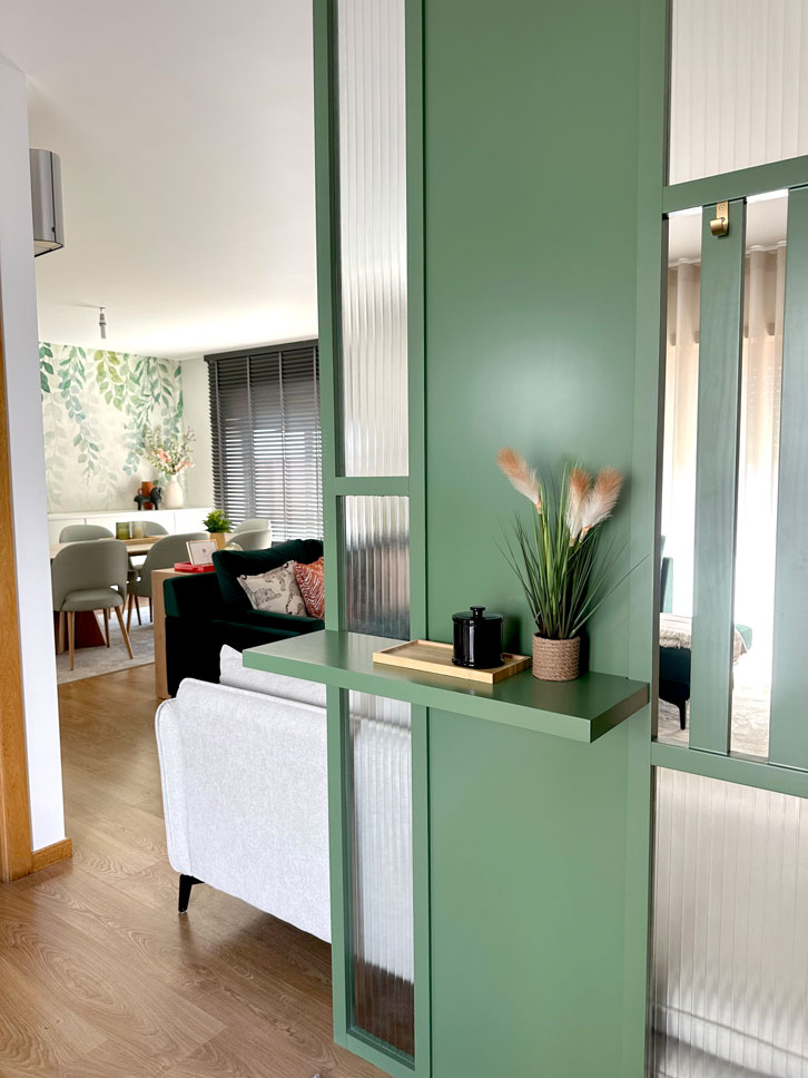 O grande desafio neste projeto de decoração de interiores foi encontrar uma solução criativa para dividir a zona da entrada da sala de estar.