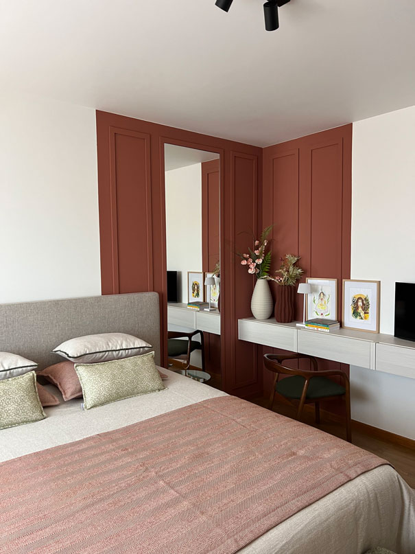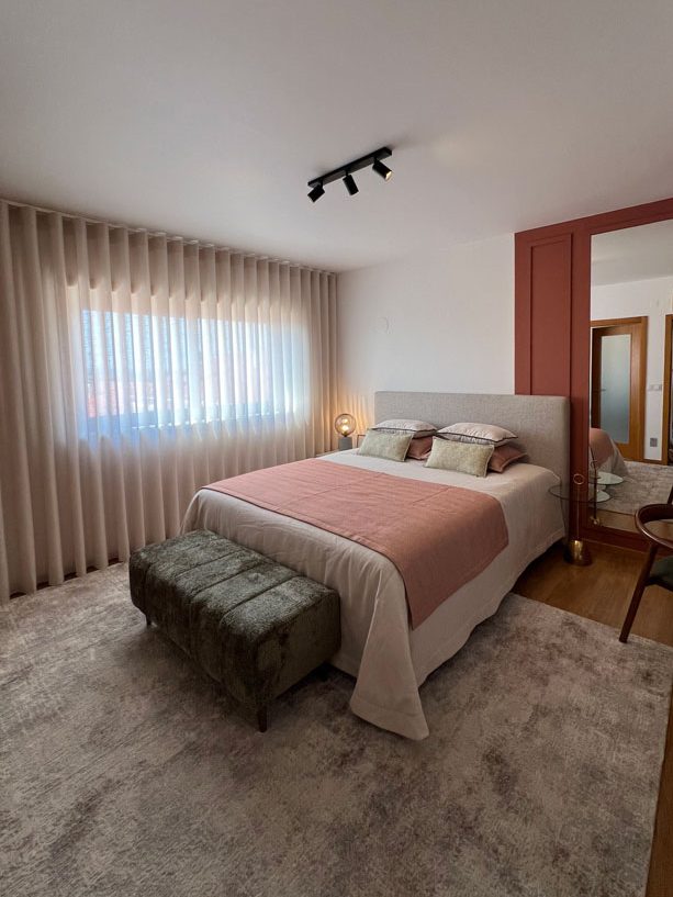 No quarto principal, os painéis decorativos o canto colorido, contrasta com as restantes paredes brancas e harmoniza com todos os elementos decorativos. O objetivo passou por criar profundidade e também fazer uma divisão de zonas dentro do quarto. Delinear de forma clara a zona de descanso (a cama) e a zona de lazer.
