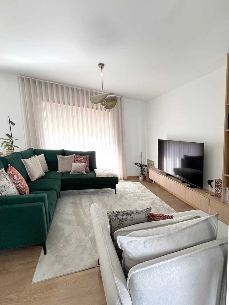 Na sala de estar, a sobriedade do mobiliário em madeira clara harmoniza-se com o impacto visual do sofá aveludado, criando um espaço de convívio simultaneamente elegante e funcional.
