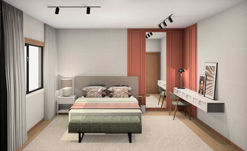 Através do projeto 3D, conseguimos criar uma divisória que não rouba espaço, nem luz natural e ainda contribui para elevar a estética do cómodo.
