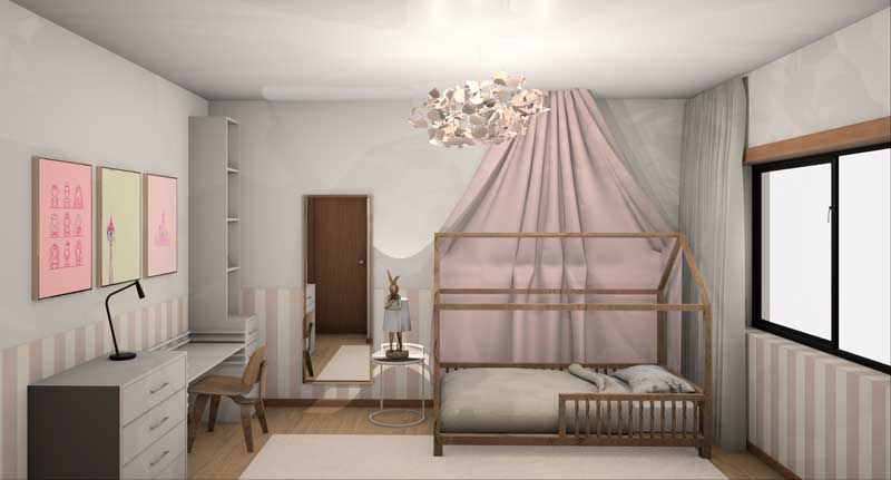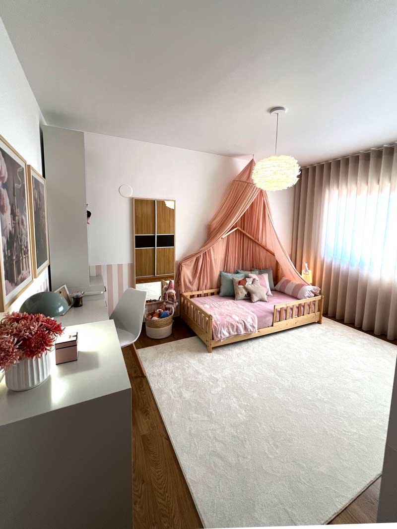 Dentro do quarto infantil, o tema escolhido envolve princesas. A cama de dossel, 100% desenhada e produzida pela nossa equipa, em madeira clara e adaptada à idade da criança que nela habita.