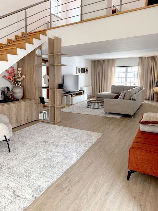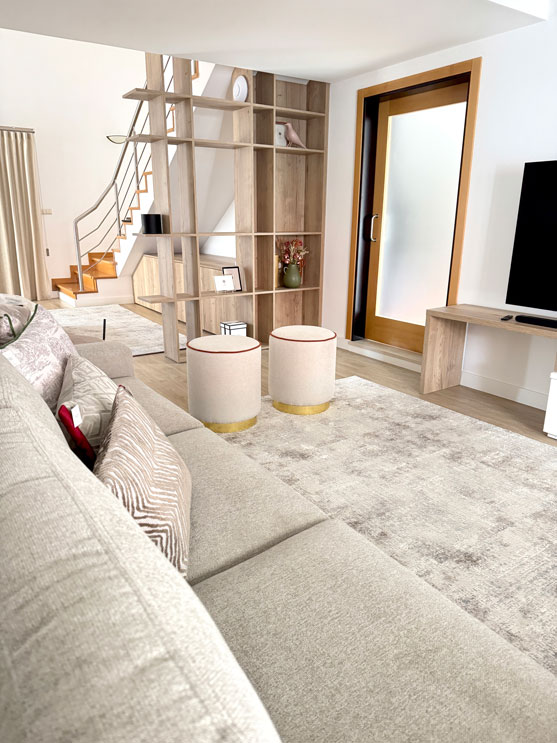 A intervenção foi pensada de forma integrada, com atenção a cada detalhe. A estante embutida sob as escadas foi desenhada à medida, permitindo aproveitar a estrutura existente para criar arrumação e organização sem comprometer a fluidez do espaço.