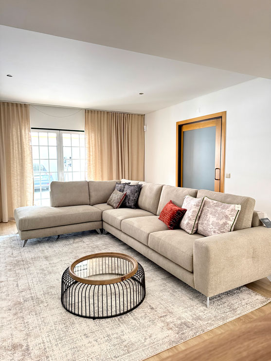 Os têxteis tiveram um papel fundamental na definição do ambiente. Almofadas, tapetes e cortinas foram escolhidos para acrescentar conforto, textura e coerência visual, contribuindo para uma sala mais equilibrada e convidativa.